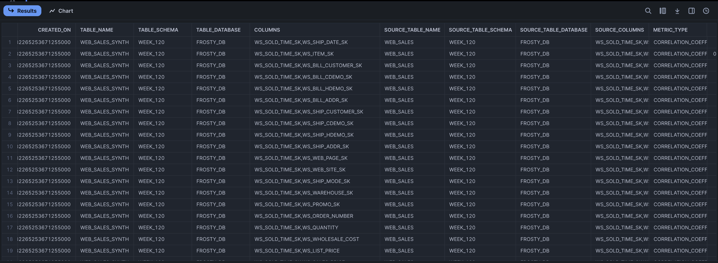 CREATE OR REPLACE VIEW WEB_ITEM as (SELECT * from SAMPLE_DATA.TPCDS_SF10TCL.ITEM LIMIT 5000);And then create a set of fake tables on top of the above views using GENERATE_SYNTHETIC_DATA() - if you're successful you should get a result that looks valid.